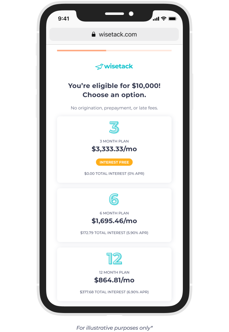 *All financing is subject to credit approval. Your terms may vary. Payment options through Wisetack are provided by our lending partners. For example, a $1,200 purchase could cost $104.89 a month for 12 months, based on an 8.9% APR, or $400 a month for 3 months, based on a 0% APR. Offers range from 0-35.9% APR based on creditworthiness. State interest rate caps may apply. No other financing charges or participation fees. See additional terms at https://wisetack.com/faqs.